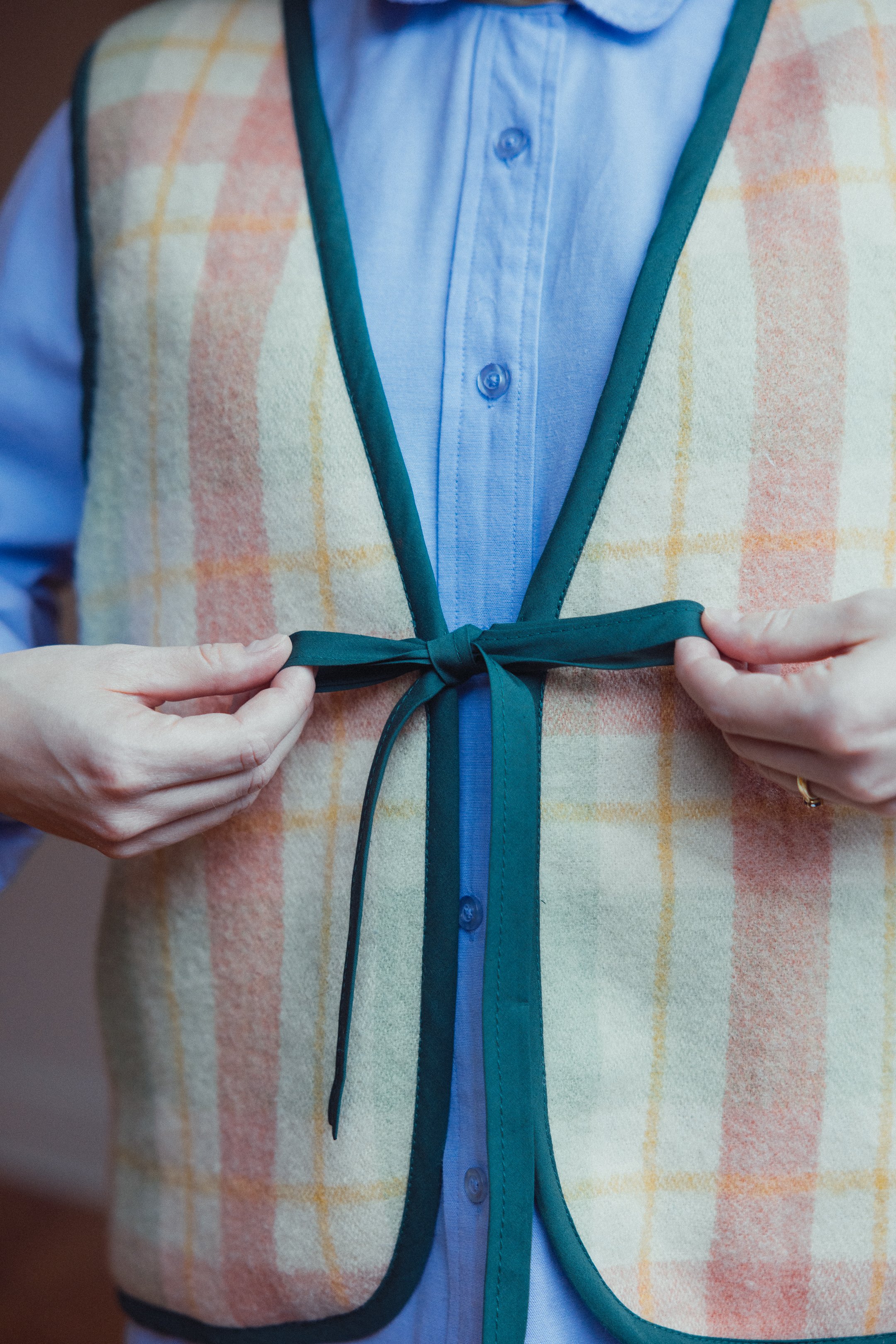 Made from a vintage wool blanket and a repurposed bed sheet, this soft green and pink beauty will elevate your winter wardrobe. Trimmed with forest green bias tape and featuring a tie-front closure.